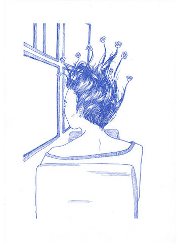 Os poemas foram escritos em espaços públicos e, por isso, queria capturar esses pequenos momentos diários — e a poesia que acontece dentro da gente nesses instantes — também nas ilustrações. No livro, as artes são impressas em preto e branco. Mas também imprimi as ilustrações em azul, em técnica de risografia, para transformar os desenhos em uma série limitada e numerada de pôsteres em tamanho A4. O livro e os cartazes em risografia estão disponíveis para compra.